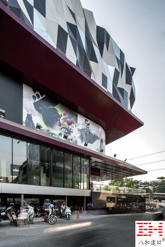 泰國TUKCOM商場的建筑外觀呈波浪形,運(yùn)用了不同造型的幕墻鋁單板,分為765經(jīng)濟(jì)三角像素。黑色,白色和鏡面加工的幕墻鋁單板通過超時(shí)分布的隨機(jī)算法。暗紅色的鋁單板框架,現(xiàn)有的廣告廣告牌已擴(kuò)大沿一側(cè)外墻的建筑主入口前臉標(biāo)志。