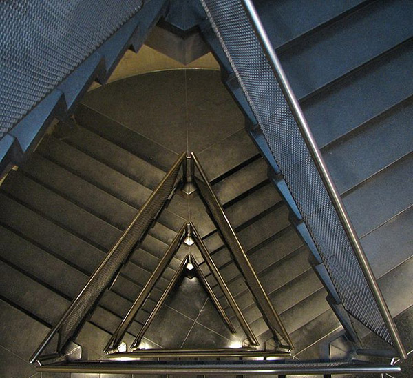中央的樓梯體現(xiàn)了三角形的模式,使用的是鋁拉網(wǎng)護板,并外部的線條也充當了美術(shù)館空間中央的雕塑。
