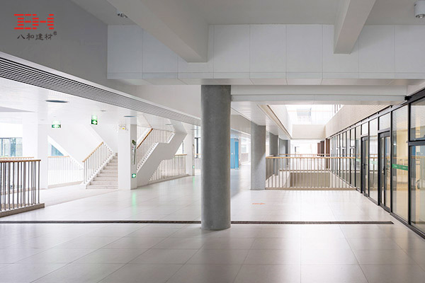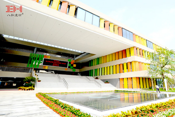 該小學多棟大樓和場館采用了鋁天花吊頂以及鋁型材方通進行裝飾。室內天花由銀白色的鋁天花吊頂與鋁型材方通搭配,構造成極具線條感的幾何圖案,室內鋁方通裝飾的窗花及柵欄的加入,使得立體美感更加明顯。建筑大庭天花及外部天花雖然只采用鋁天花吊頂裝飾,其與室外空曠的環境以及明亮的自然光相得益彰,給人一種簡潔大方的恢弘感。