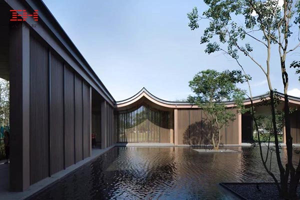 綠地·樾湖書(shū)院采用鋁鎂錳金屬屋面和混凝土框架結(jié)構(gòu),選取深灰色金屬屋面板與仿木紋鋁構(gòu)件,以現(xiàn)代材料技法演繹中式意境。木紋鋁板鋁方通迎合了古風(fēng)建筑多采用木材搭建和裝飾的特征,將宋式書(shū)院的風(fēng)格場(chǎng)景同現(xiàn)代建筑的空間格調(diào)充分融合。造出別具一格的“宋韻田園”般的現(xiàn)代居住新體驗(yàn),引領(lǐng)美好生活方式。