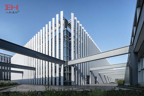 鋁板百葉格柵幕墻與玻璃幕墻虛實結合,體現了現代簡約的建筑風格,簡約而莊重,復合了服務中心對外展示的形象。功能上,鋁板百葉有效阻擋日曬,滿足采光,為室內人員創造一個現代、舒適宜人的辦公環境。