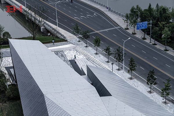 灰白色鋁單板與周圍環境色調統一,又格外出眾,凸顯翡翠館文化內涵的厚實感。山石的形態,雕塑化的形體,在鋁單板的裝飾下,使其成為地標性的景點,吸引人群從而為建筑注入幾分活力。
