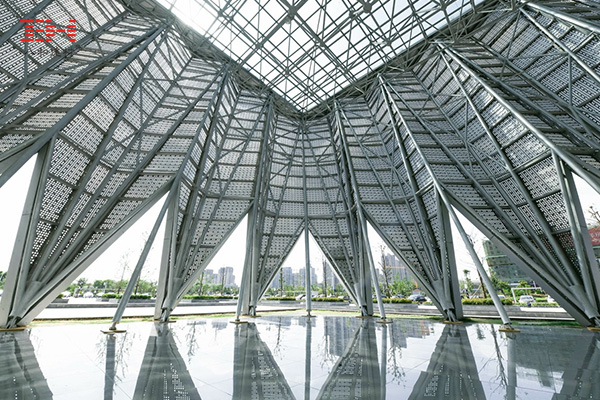 亳州市體育館為了營(yíng)造半室內(nèi)半室外的公共空間,外表皮采用孔徑4厘米的穿孔鋁板。考慮到亳州的氣候原因,穿孔鋁板使得體育館對(duì)氣候的適應(yīng)非常理想,既能夏季穿透對(duì)流風(fēng),又能冬季穿透溫暖的陽(yáng)光,雨季還能避雨。