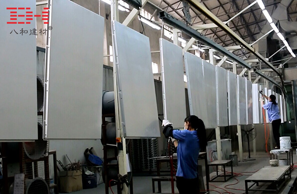 八和建材為保證大型工程項目的需求和應對每年龐大的訂單,專門配備兩條國際標準氟碳鋁單板全自動噴涂生產線和兩條標準天花噴涂線。每天二十四小時不停運轉,每條噴涂線日均噴涂的氟碳鋁單板可達到4000平方米,保證了產品加工的按期完成。而且選擇日本蘭氏第六代全自動噴涂系統,這屬于最頂尖的噴涂設備,最大的提高噴涂的效率和保證了氟碳鋁單板的完美品質。