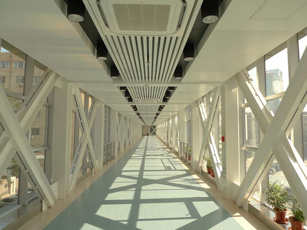 中國醫科大學附屬第一醫院走廊過道使用鋁方通、鋁單板、沖孔鋁單板、鋁扣板組合式天花吊頂,整個鋁天花采用白色聚酯噴粉,讓過道看起來更加明亮,寬敞。