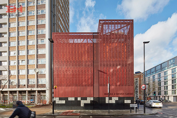 英國Bunhill 2能源中心是一個利用地鐵設施排放的廢熱,為附近住宅、休閑中心以及學校供暖的設施。其外墻使用了深色的金屬穿孔鋁單板,偏紅的配色呼應了熱能的主題,區別于周圍的建筑,格外顯眼。