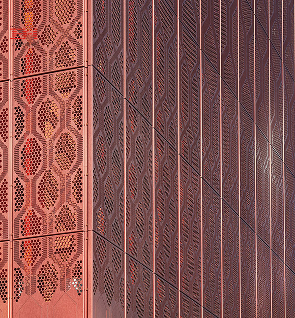 能源中心外墻穿孔鋁板通過穿孔塑造而成的圖案,隨著內部設施所要求的通風程度而變化,為立面帶來動態而透明的觀感。圖案的尺寸隨著高度的上升而等比增大,猶如喚醒了埋藏在地下的、由社區供熱管道、地鐵隧道和空調管道構成的龐大網絡。