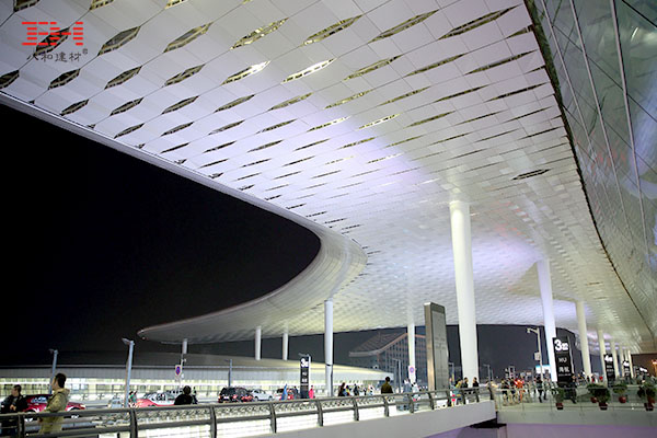 八和建材為深圳機場T3航站樓提供的造型鋁單板、吊頂鋁單板,屋面側墻自然卷曲過渡,與以往墻面有著不同的設計,復雜多變,不對稱但融為一種肌理。