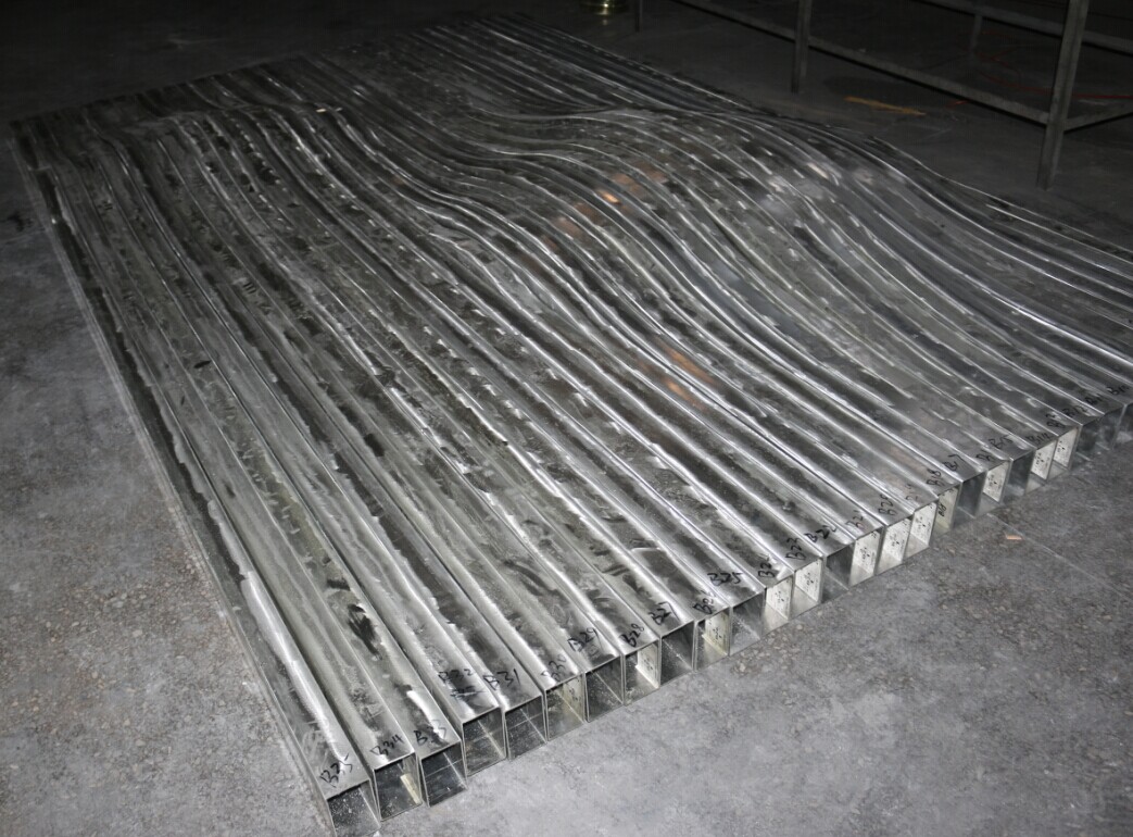 這次設計用到的產品是仿木紋弧形鋁方通吊頂,整體組裝起來就是一個個半球面形狀,給人一種高低起伏的感覺。整個弧形鋁方通鈑金部分加工,全用八和建材全自動數(shù)控沖床開料,再經過燒焊,打磨工序完成,對工廠技術要求很高,從圖紙深化,到開料編程,如有一個環(huán)節(jié)出錯,就達不到設計所需要的效果。