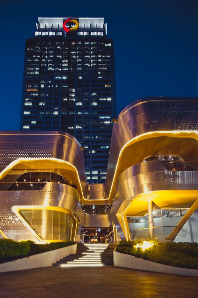 泰國The Groove購物中心是曼谷現狀一族所中央世界購物中心的擴建項目,包括4000平方米的封閉式商業零售、8000平方米的餐飲及酒吧以及露天式圍合庭院。該項目旨在以歐洲的咖啡文化和露天餐飲帶動和激活曼谷街道活力和親切感,從而定義新型的當代戶外餐飲和活力步行街的街道文化。在裝飾材料上大量采用了幕墻鋁單板、沖孔鋁單板、木紋鋁單板及仿木紋型材鋁方通天花產品。立面幕墻使用了背照式鋁板系統,能將照明、圖形、個性和視覺很好地融入美麗而優雅的建筑表皮。動態的LED背光源系統創建了獨特的夜間燈光效果,讓建筑在繁忙的曼谷街道引人注目。