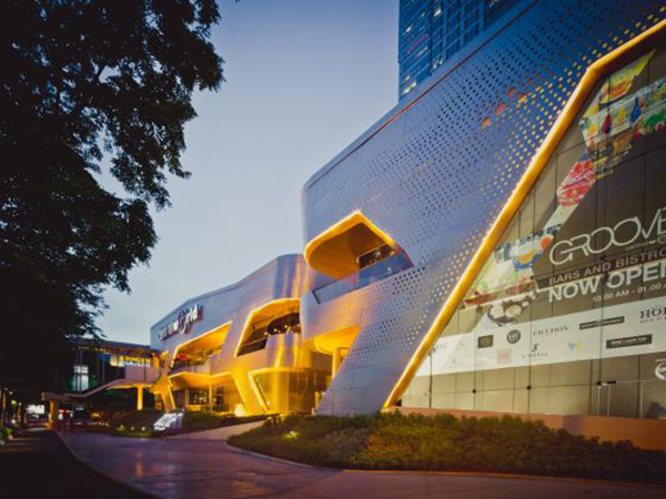 泰國The Groove購物中心是曼谷現狀一族所中央世界購物中心的擴建項目,包括4000平方米的封閉式商業零售、8000平方米的餐飲及酒吧以及露天式圍合庭院。該項目旨在以歐洲的咖啡文化和露天餐飲帶動和激活曼谷街道活力和親切感,從而定義新型的當代戶外餐飲和活力步行街的街道文化。在裝飾材料上大量采用了沖孔鋁單板、木紋鋁單板及弧形鋁方通天花產品。立面幕墻使用了背照式鋁板系統,能將照明、圖形、個性和視覺很好地融入美麗而優雅的建筑表皮。動態的LED背光源系統創建了獨特的夜間燈光效果,讓建筑在繁忙的曼谷街道引人注目。