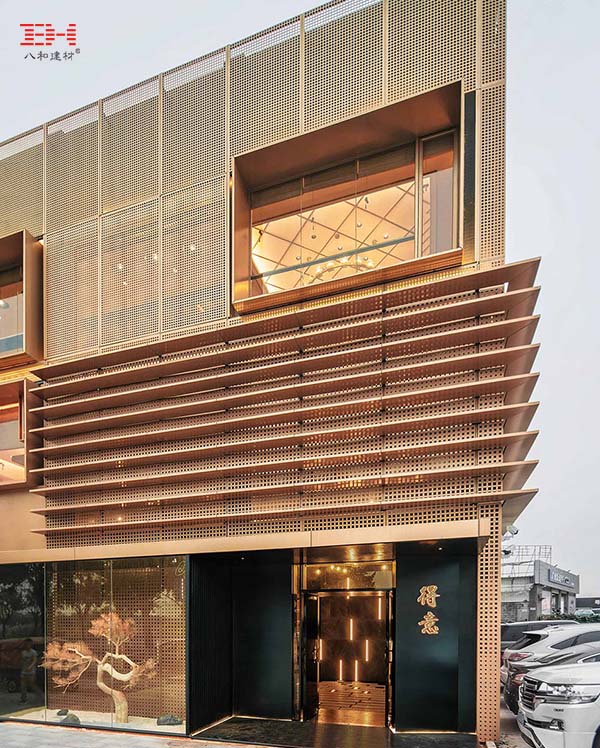 穿孔鋁板外墻已經被廣泛地應用于藝術立面的塑造,然而每次都能看到眼前一亮的獨特的表現風格,這源于沖孔鋁板的靈活的多樣多變性。這次廣州得意日式鐵板料理餐廳,運用銅色穿孔鋁板,在對外墻特征的適配上,佐以簡約造型,成就了一個風格鮮明,亮眼而又內斂的外立面。