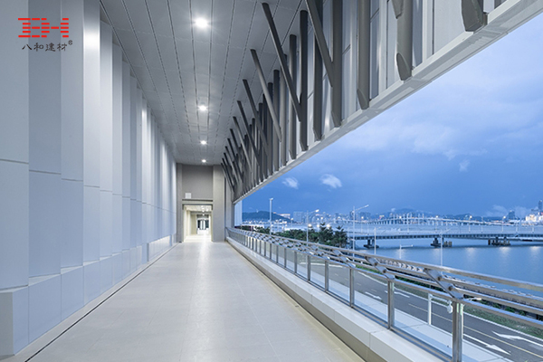 條形鋁扣板具有阻燃、防腐、防潮的優點,裝拆方便,方便施工和維護的優點,是現代建筑大樓內部天花的首選裝飾材料,港珠澳大橋珠海口岸大樓室內及室外走廊均選用了條形鋁扣板裝飾。