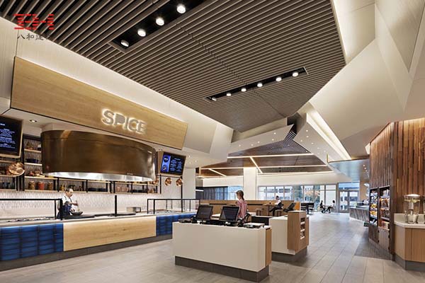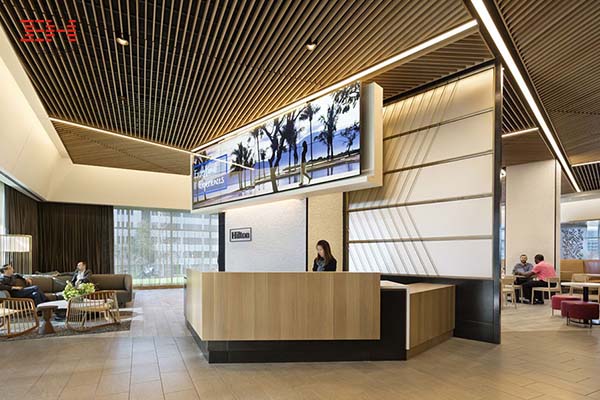 希爾頓總部的餐廳是一個休閑的社交場所,正如大多數購物商場頂樓的餐飲區一樣,采用了主流的木紋型材鋁方通天花吊頂裝飾。同時,木紋的自然材質結合現代裝飾風格,正是希爾頓的品牌特征,木紋鋁方通的裝飾亦常見于其旗下遍布全球的星級酒店。