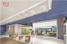 整個項目以佳德的企業色,天空的“藍色”和工藝管道的“黃色”作為主色調貫穿。室內,作為視線入口引導,把外立面的藍色元素引入室內,讓“藍天”無處不在。運用簡單流暢的鋁方通線條貫穿整個空間,一氣呵成。空間色調上選用頗具科技感銀白色作為基調,讓空間的線條感與純凈的色調相映成輝,突顯企業追求純粹而堅定的環保科技夙愿,也使得空間富有未來科技感。