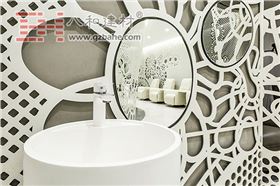 墻的圖案采用蕾絲,一種典型的具有鮮明女性特征的服裝樣式,通過1mm鋁板激光切割最終實現了抽象的轉換和實現。蕾絲圖案的位置和尺寸已在空間內為客戶的視覺關系提供參考。