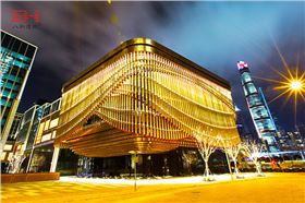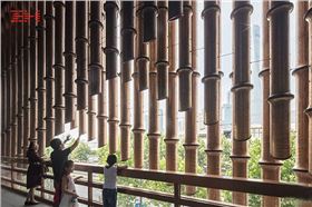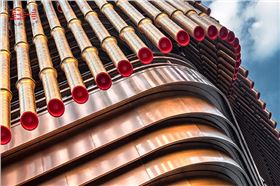 上海復星藝術中心外表皮是由鋁圓管組成的三層幕簾,每層幕簾使用不同的古銅金黃色,富有層次感。675根鋁圓管長度不一,直徑各異,重重疊疊地組成三層藝術幕簾,呈現多樣的視覺效果。