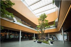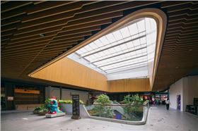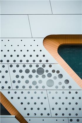 泰國The Groove購物中心是曼谷現狀一族所中央世界購物中心的擴建項目,包括4000平方米的封閉式商業零售、8000平方米的餐飲及酒吧以及露天式圍合庭院。該項目旨在以歐洲的咖啡文化和露天餐飲帶動和激活曼谷街道活力和親切感,從而定義新型的當代戶外餐飲和活力步行街的街道文化。在裝飾材料上大量采用了幕墻鋁單板、沖孔鋁單板、木紋鋁單板及仿木紋型材鋁方通天花產品。立面幕墻使用了背照式鋁板系統,能將照明、圖形、個性和視覺很好地融入美麗而優雅的建筑表皮。動態的LED背光源系統創建了獨特的夜間燈光效果,讓建筑在繁忙的曼谷街道引人注目。