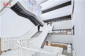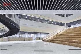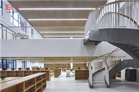 其中室內鋁方通天花主要運用于半開放性的場所如:中庭、走廊、通道等。導向性的鋁方通線條與其他建筑元素巧妙搭配,創造出空間幾何上的建筑美,成就活力開放的學校環境。