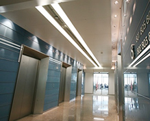 現(xiàn)代風(fēng)格的辦公樓電梯間會(huì)經(jīng)常采用一些精致的裝扮,吸引著人的關(guān)注。電梯間的吊頂造型設(shè)計(jì),選用鋁單板吊頂配合燈槽的設(shè)計(jì)具有層次感。