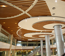 購物中心中庭天花吊頂-仿木紋鋁方通吊頂與石膏板、鋁單板完美結合,色彩與線條的搭配,裝飾效果獨特。