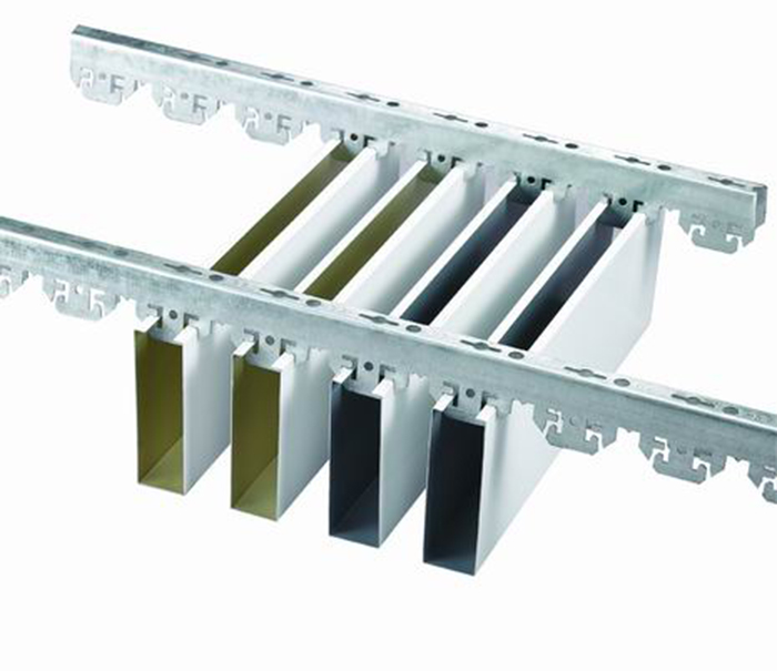 3、把U型鋁方通天花扣進(jìn)龍骨。因為U型鋁方通龍骨都是按設(shè)計要求,以鋁方通的間距為準(zhǔn)定制的。安裝時只需要把鋁方通扣進(jìn)龍骨相應(yīng)的齒里就行。先把龍骨的鎖片掰開,再把鋁方通卡進(jìn)龍骨里,最后把鎖片壓回卡住。